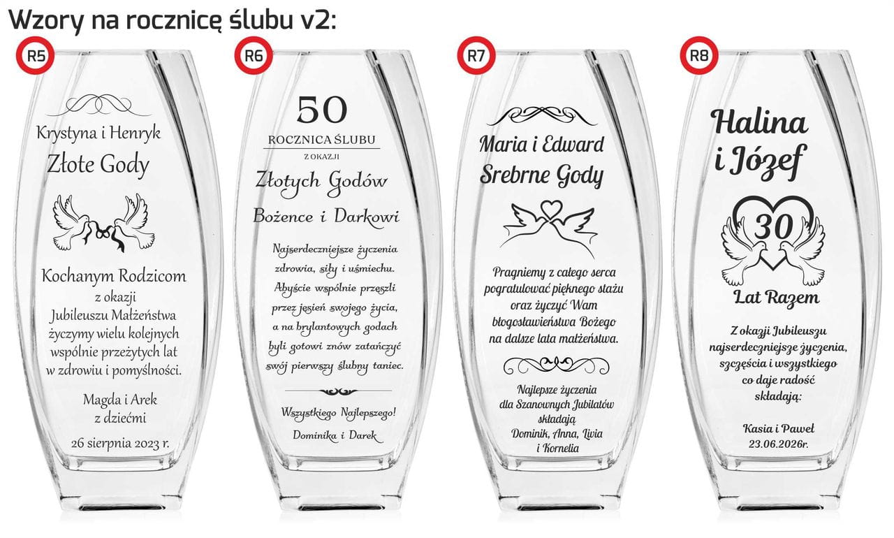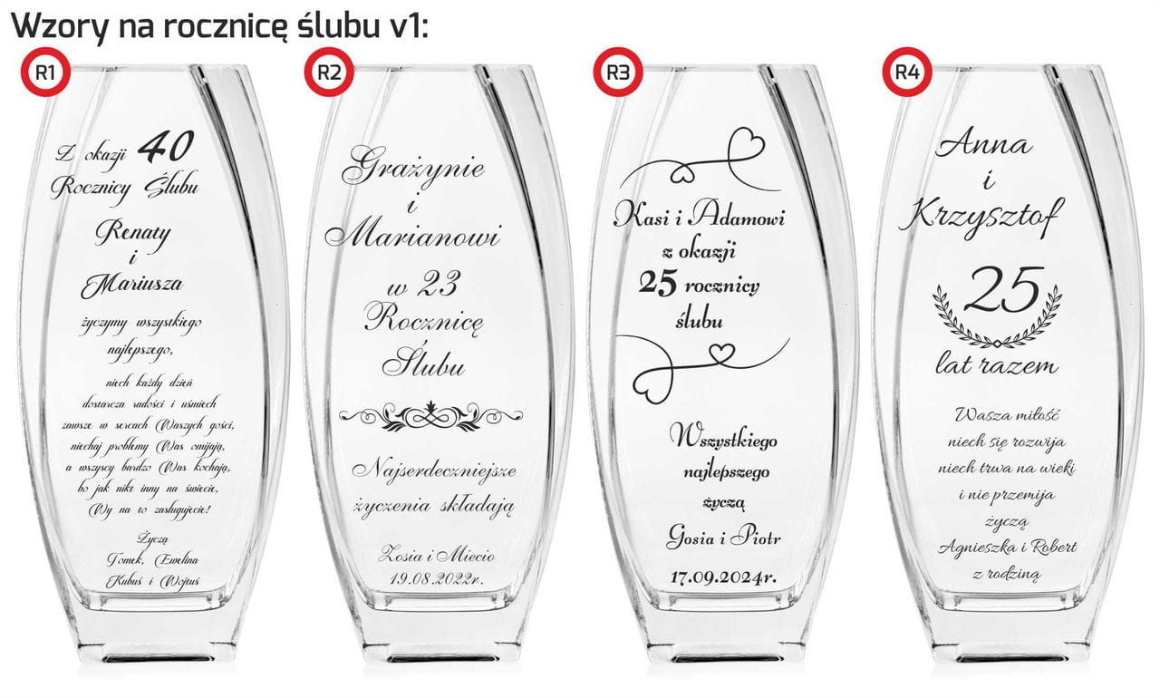 - treść graweru: na górze wazonu: Kasia i Andrzej, 30 lipca 2019, na dole wazonu: życzą Krystyna z Rafałem