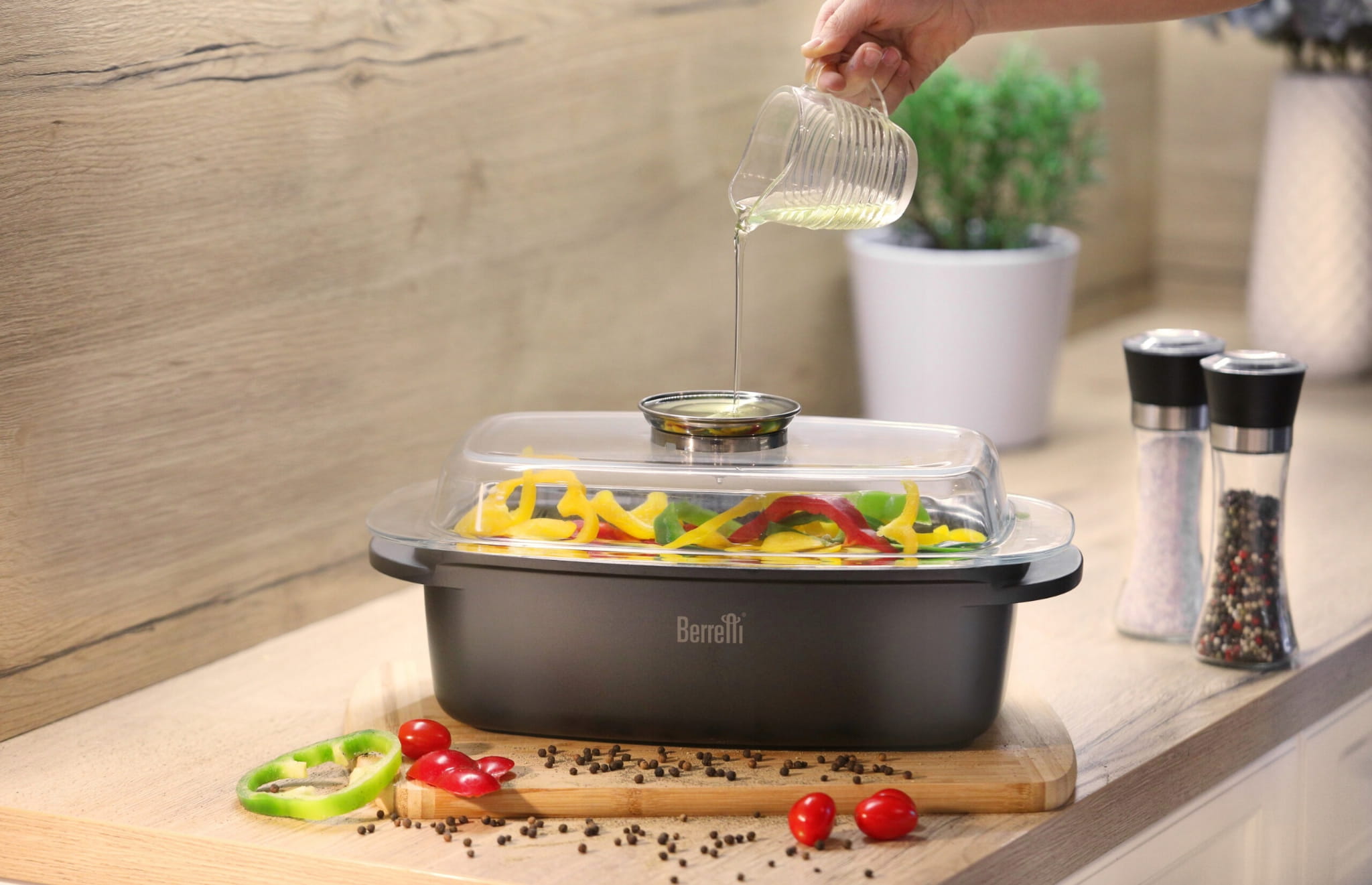 - Brytfanna wyposażona jest w pokrywę z aromatyzerem, przez który można dolewać np. wodę do potrawy bez podnoszenia pokrywy.