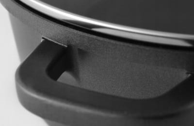 - Pokrywa wykonana ze szkła hartowanego co umożliwia doglądanie potrawy bez konieczności podnoszenia pokrywki