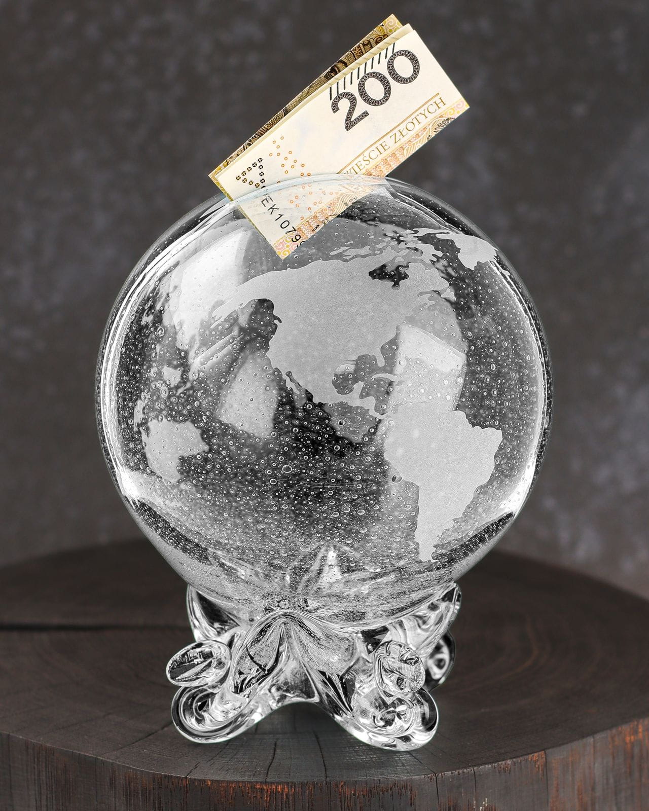 Duża szklana ręcznie wykonana skarbonka KULA "Globus"