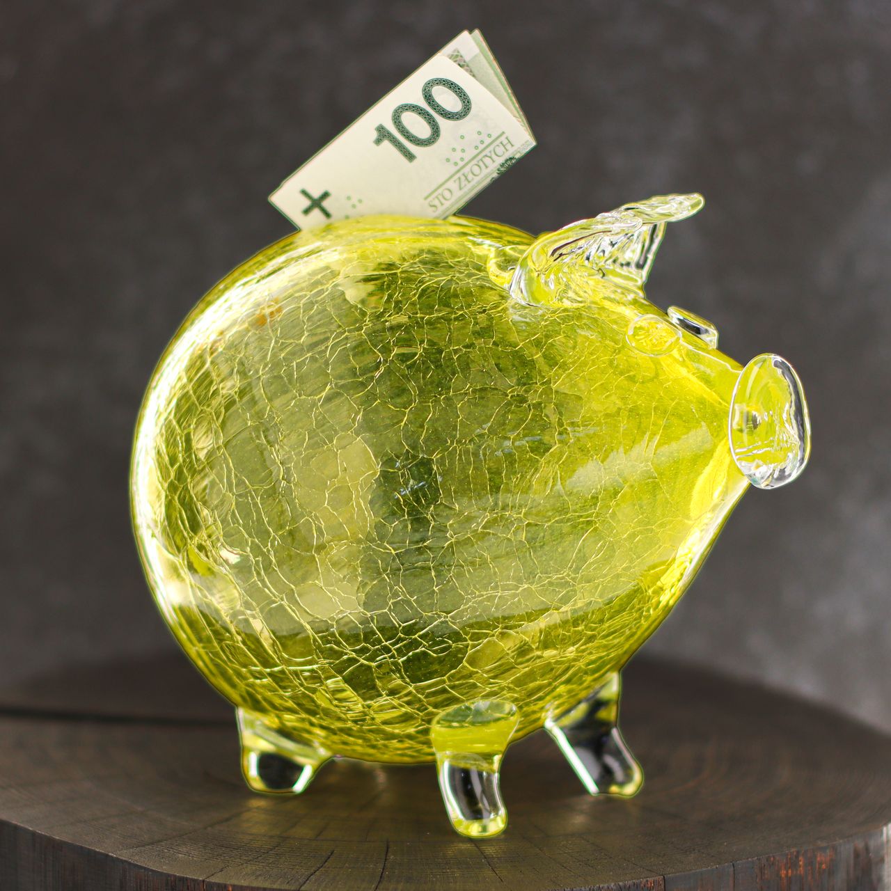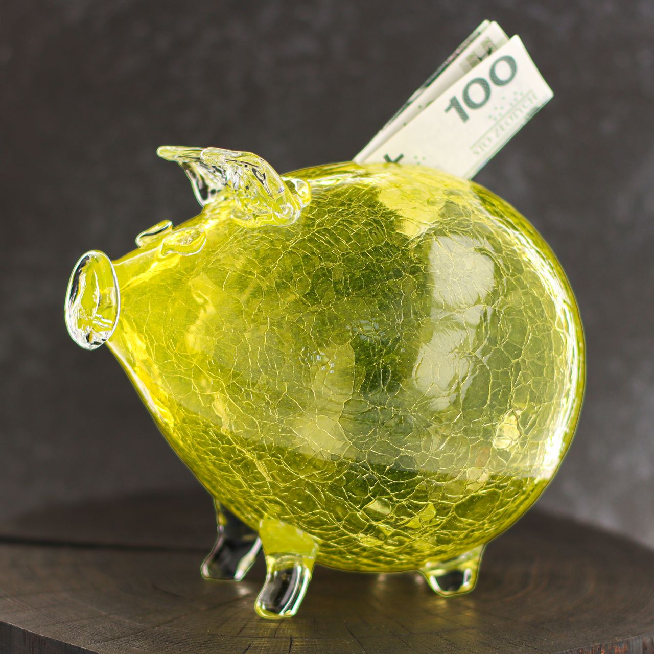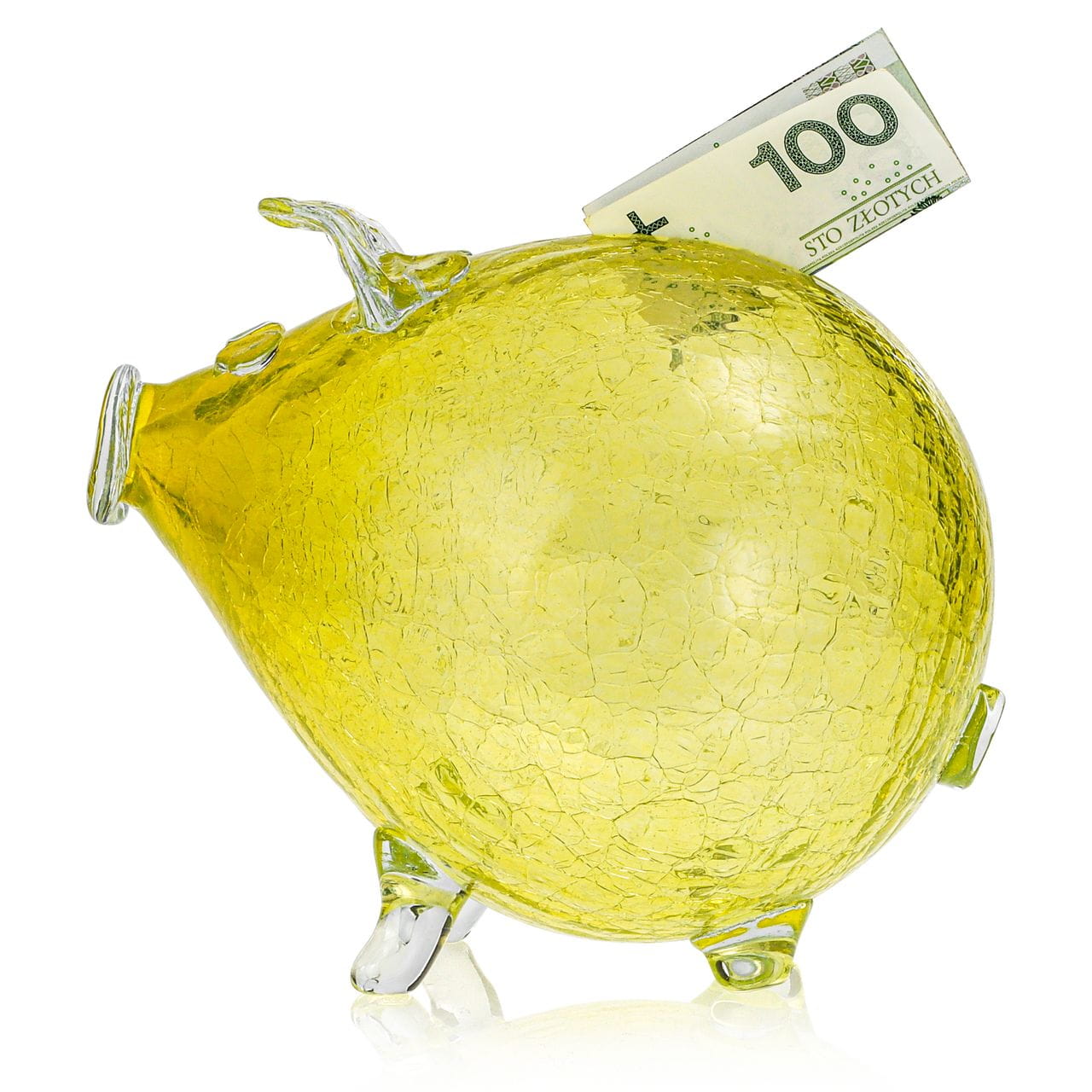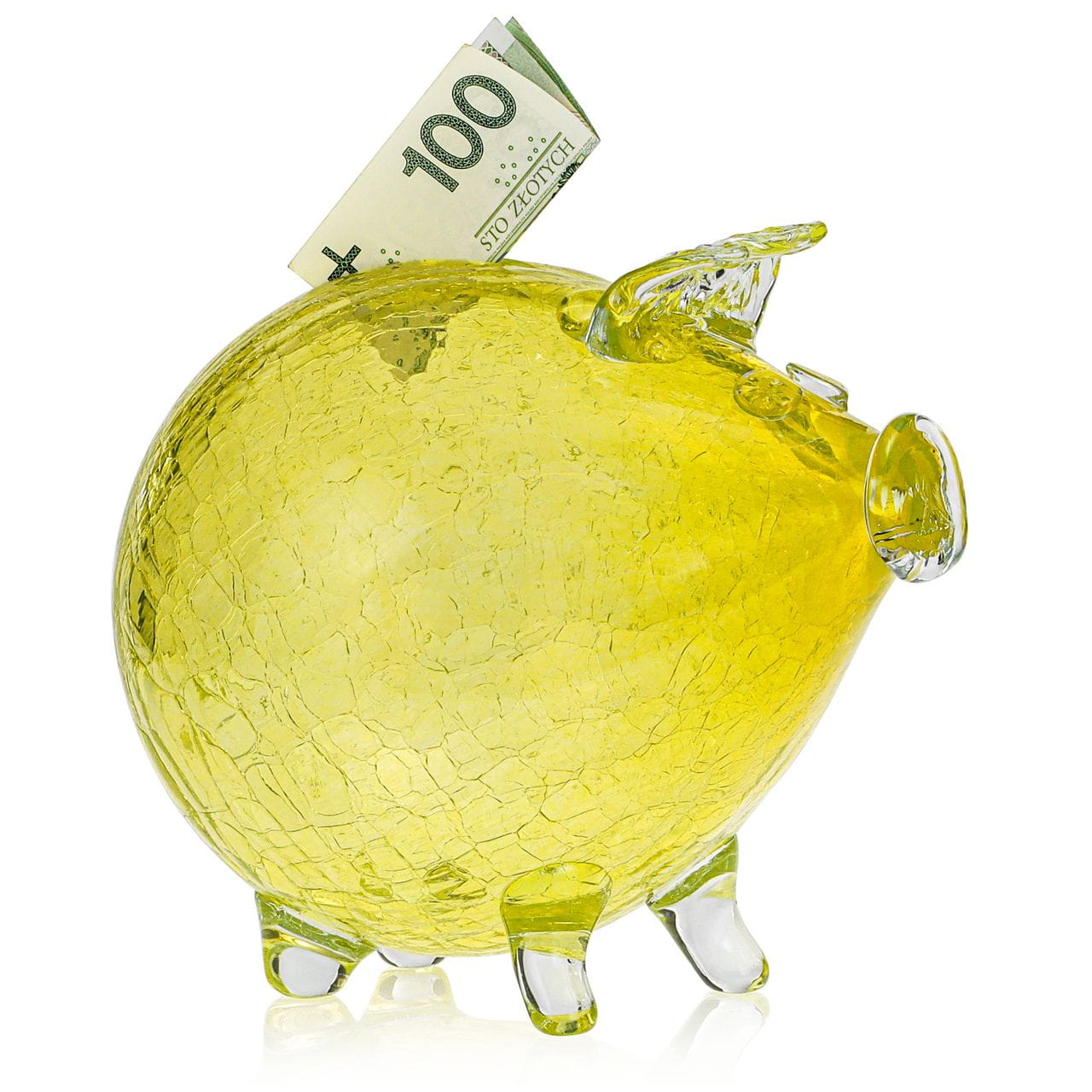 Duża szklana skarbonka ŚWINKA Crackle ŻÓŁTA