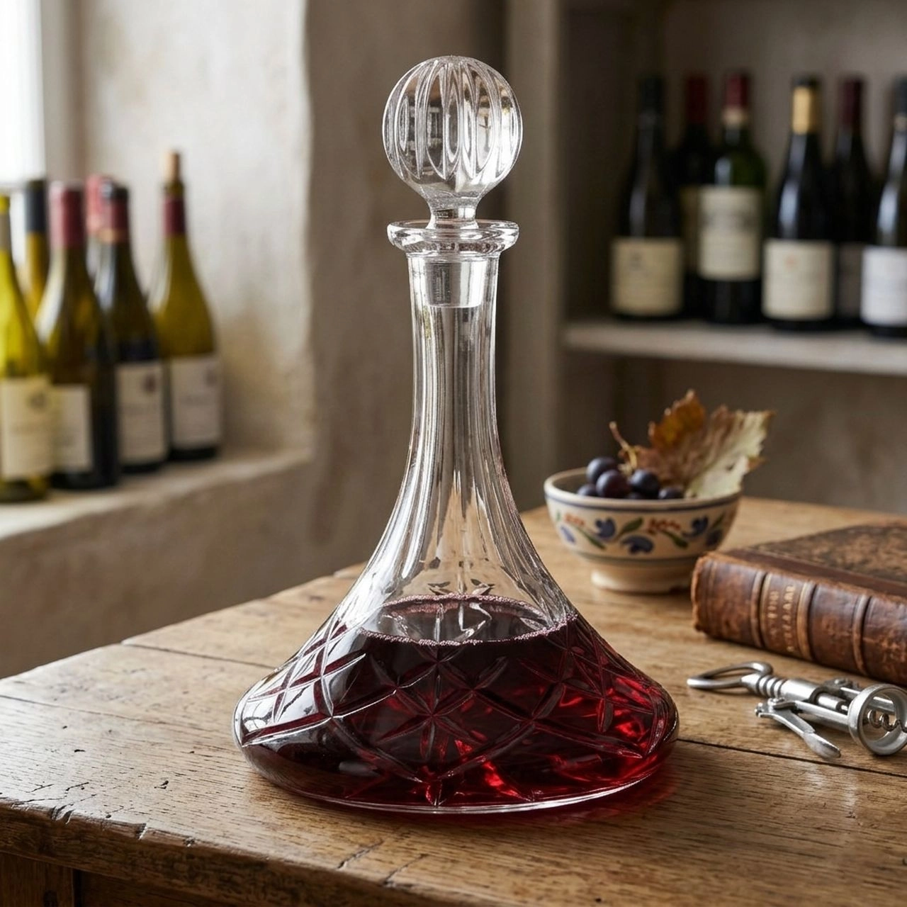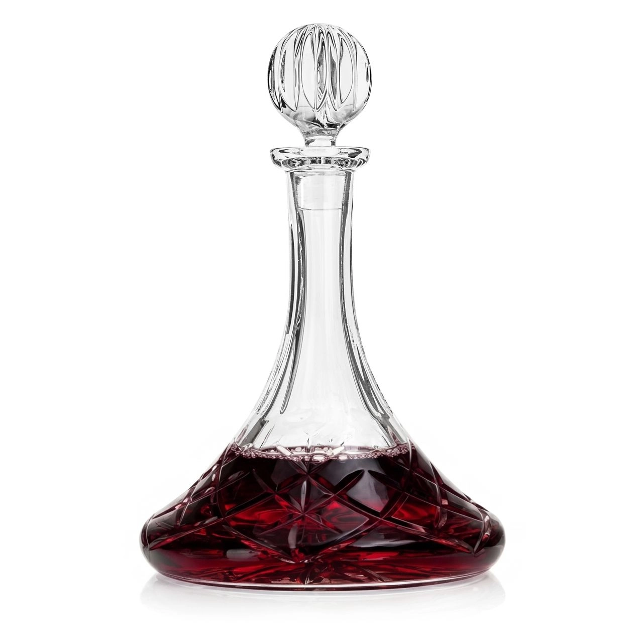 Elegancki, kryształowy dekanter z kolekcji "BRIXTON", charakteryzujący się klasycznym kształtem i wyjątkowym wzornictwem. Wykonany z ołowiowego szkła kryształowego (24% PbO), wyróżnia się swoją masywnością i solidnym wykonaniem. Jego powierzchnia ozdobiona jest gęsto umieszczonymi krzyżowymi nacięciami oraz pionowymi żłobieniami, tworzącymi tradycyjny wzór, który dodaje mu wyrafinowanego charakteru.