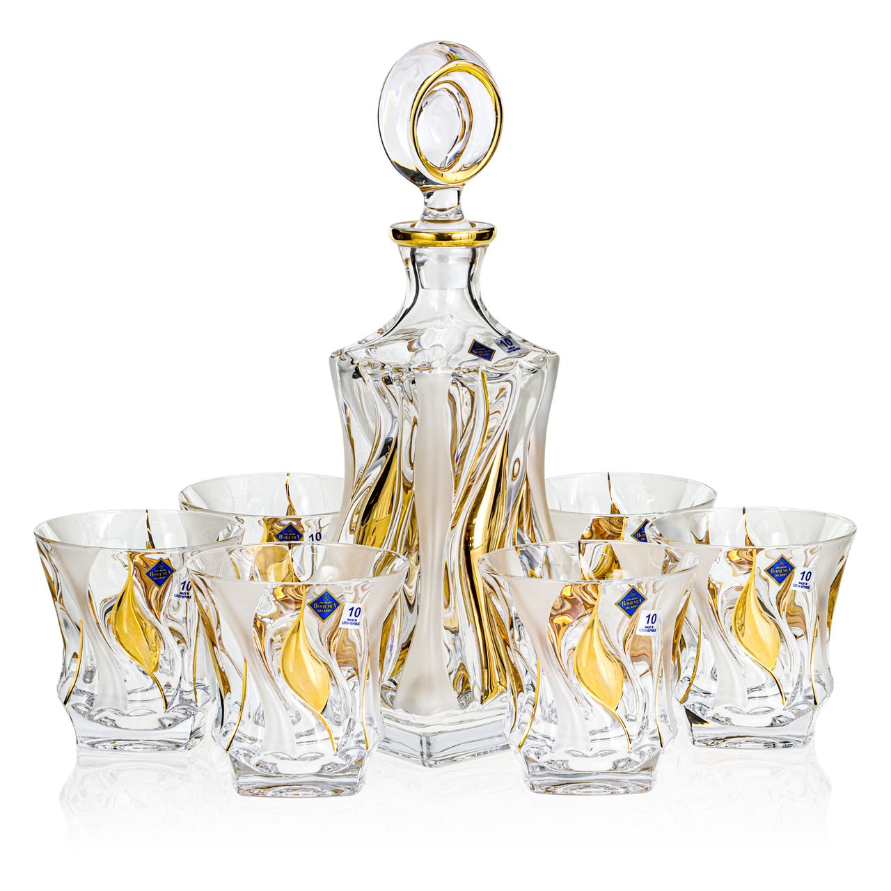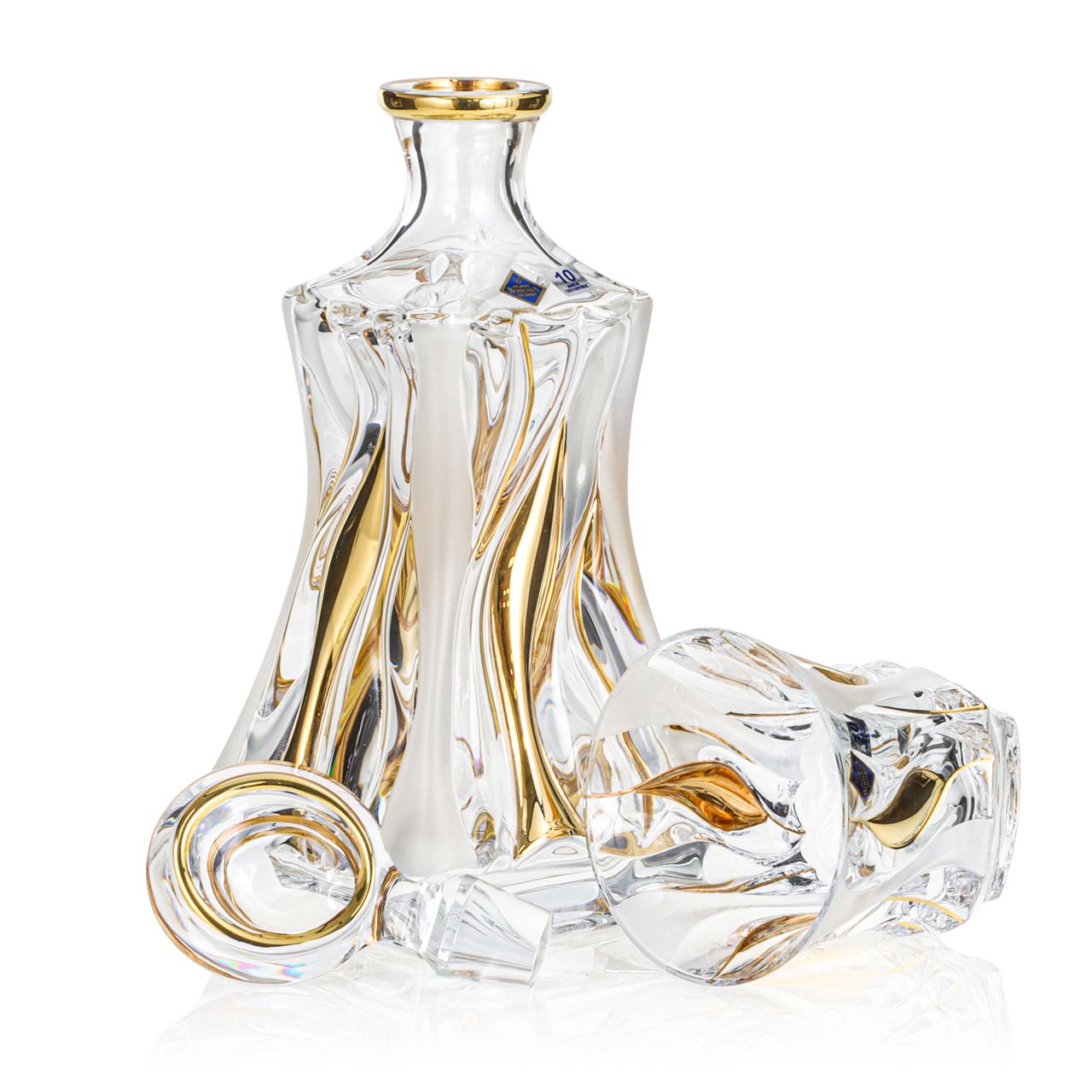 Zestaw przygotowany przez firmę Szkło-Krosno składający się z oryginalnych szklanek i karafki marki Bohemia, dostępny ze zdobieniem oraz drewnianą skrzynką Szkło-Krosno.