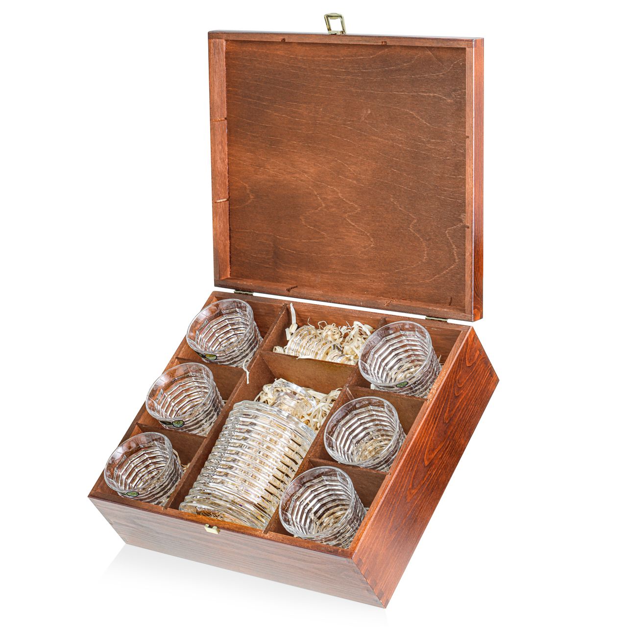 Cena za komplet karafka + 6 szklanek w pięknej drewnianej skrzynce z możliwością graweru na JEDNEJ stronie - przodzie skrzynki.