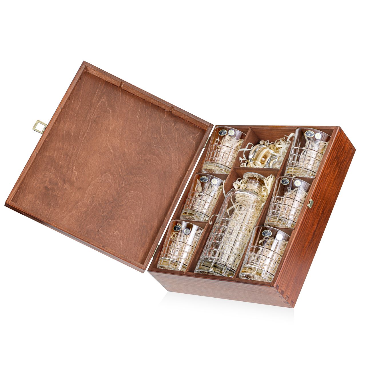 Cena za komplet karafka + 6 szklanek w pięknej drewnianej skrzynce z możliwością graweru na JEDNEJ stronie - przodzie skrzynki.