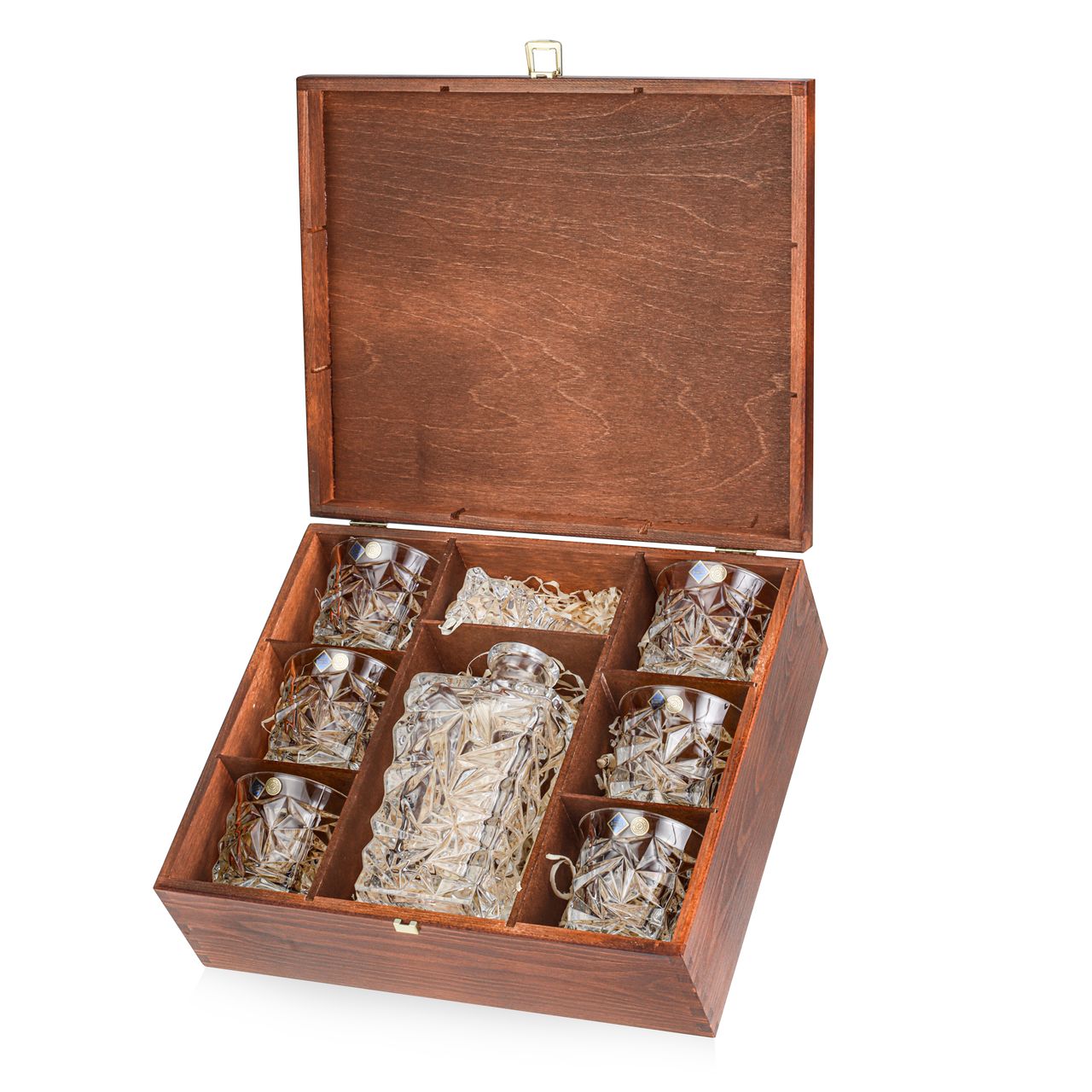 Cena za komplet karafka + 6 szklanek w pięknej drewnianej skrzynce z możliwością graweru na JEDNEJ stronie - przodzie skrzynki.