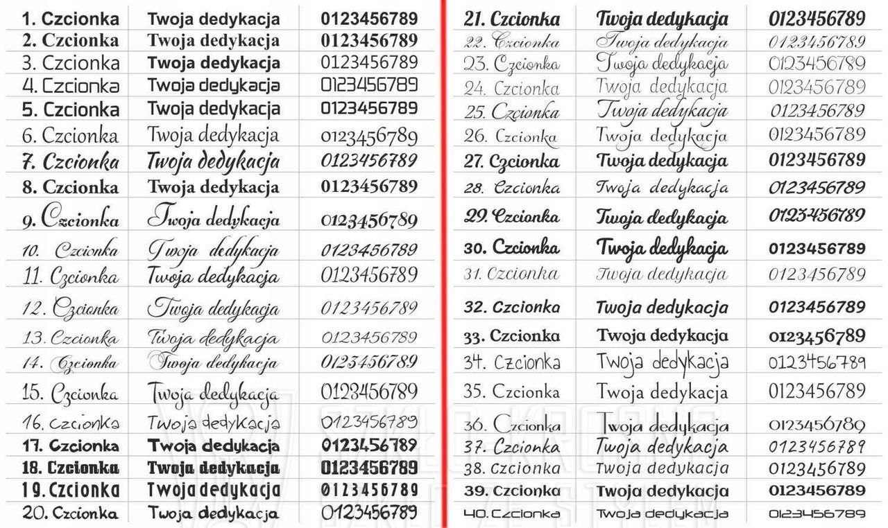 Po zakupie wpisz w "Dodatkowych informacjach" który numer czcionki wybierasz od 1 do 40. UWAGA! Jeżeli czcionka nie zostanie wskazana przez klienta po zakupie - zostanie dobrana przez grafika w ten sposób aby grawer był możliwie najbardziej czytelny i wyraźny.