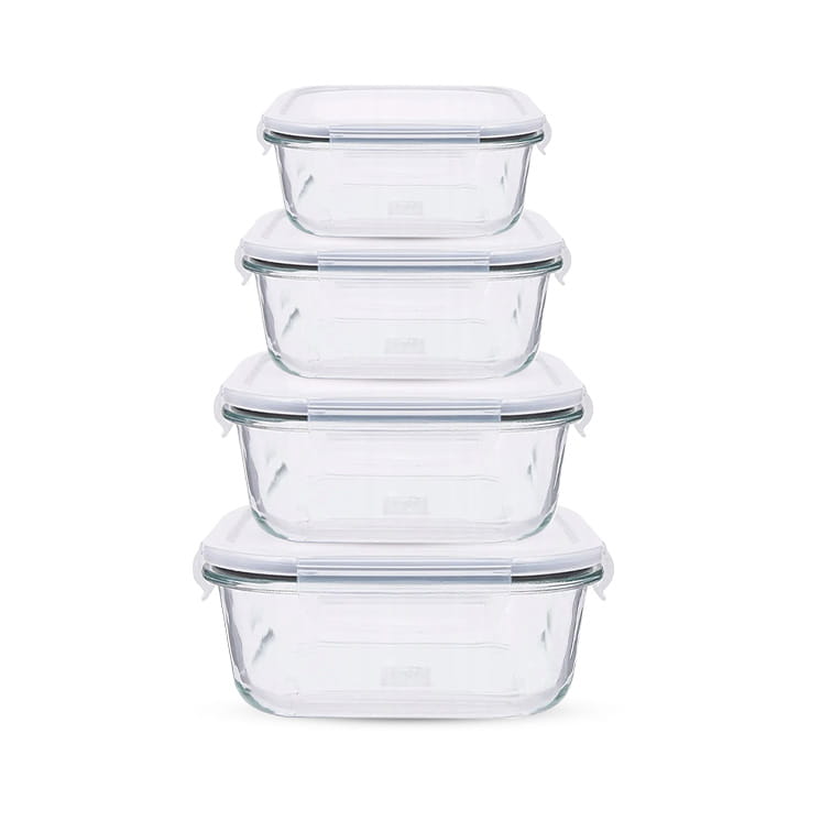 KOMPLET pojemników szklanych na żywność KWADRATOWYCH LUNCHBOX z pokrywką ALTOM FRESH 300+450+750+1100ml