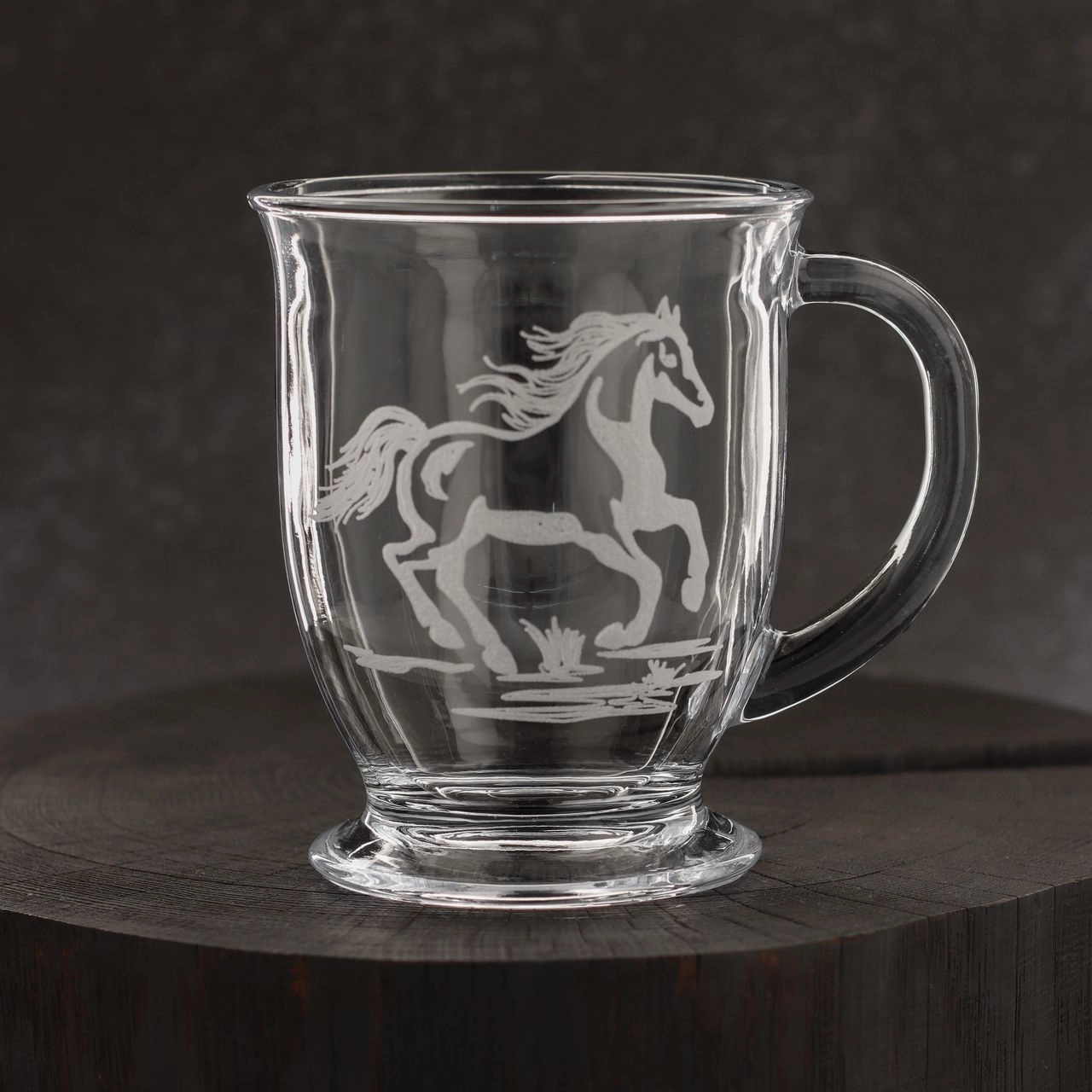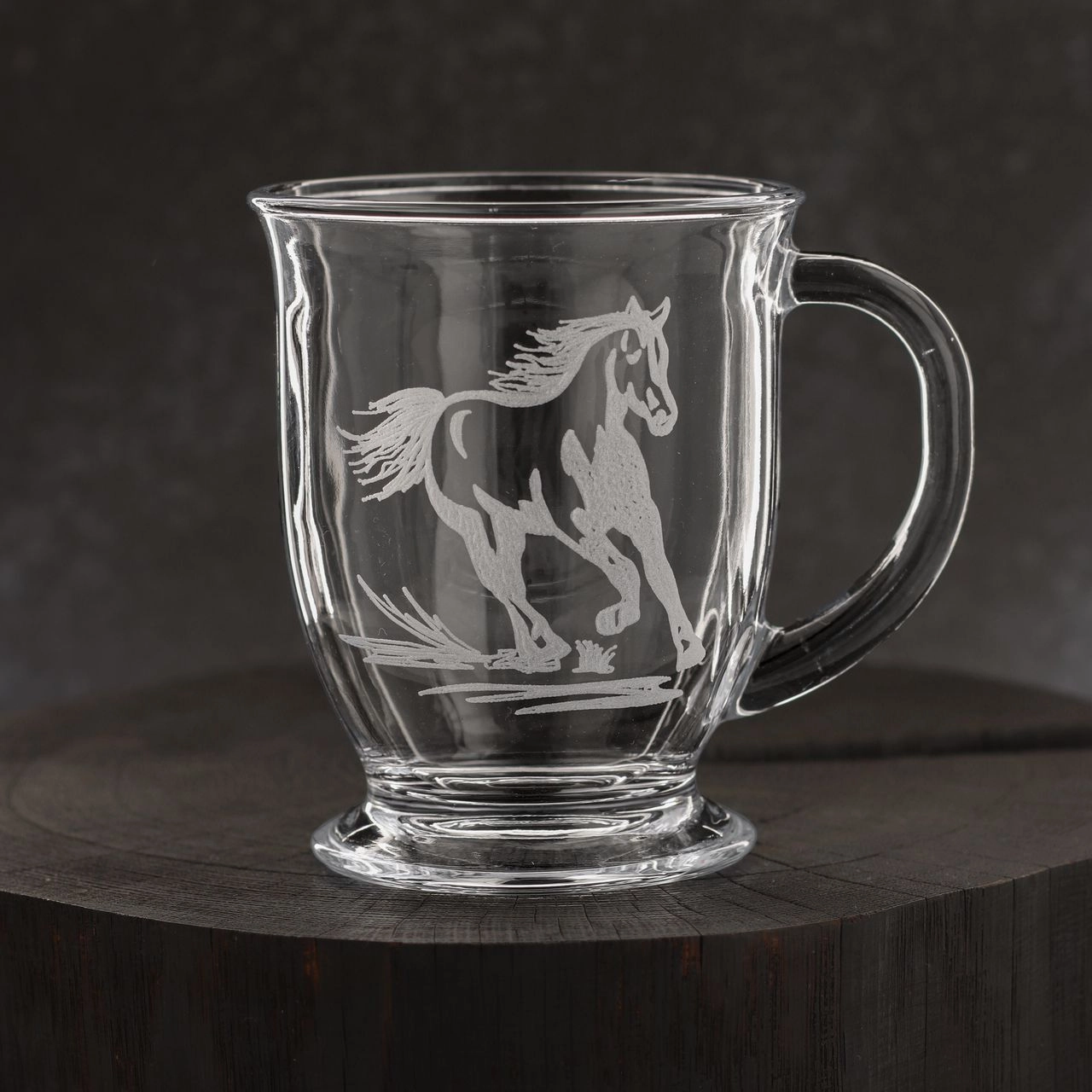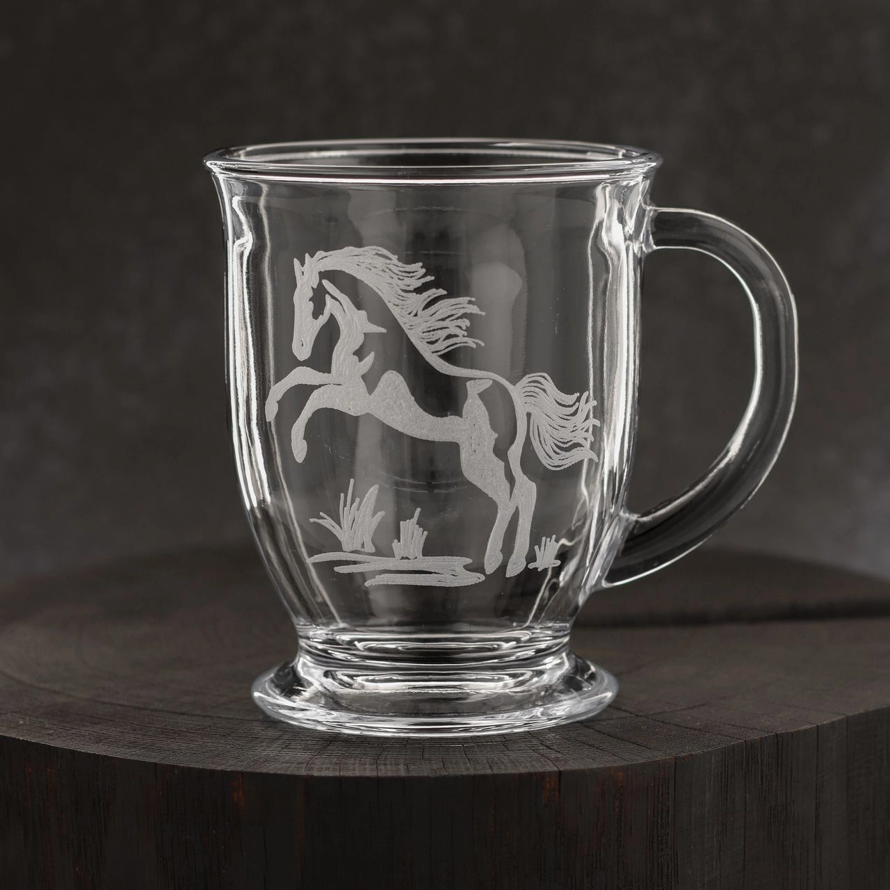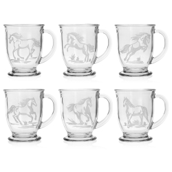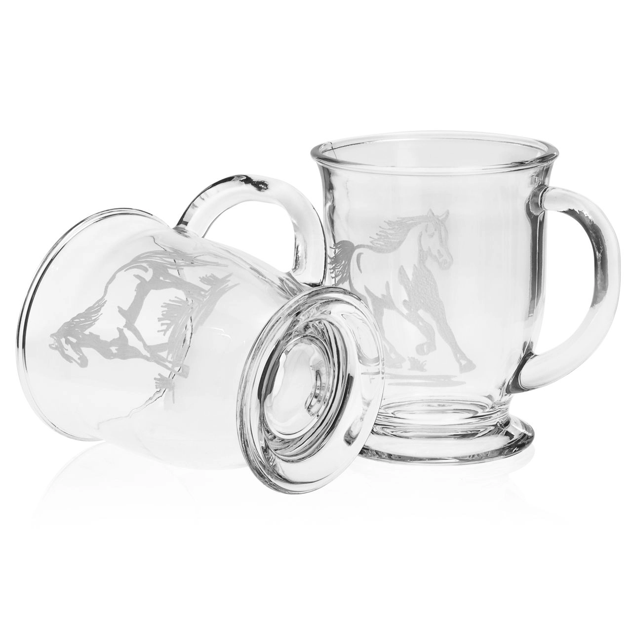 Na każdej szklance znajduje się inny motyw z koniem.