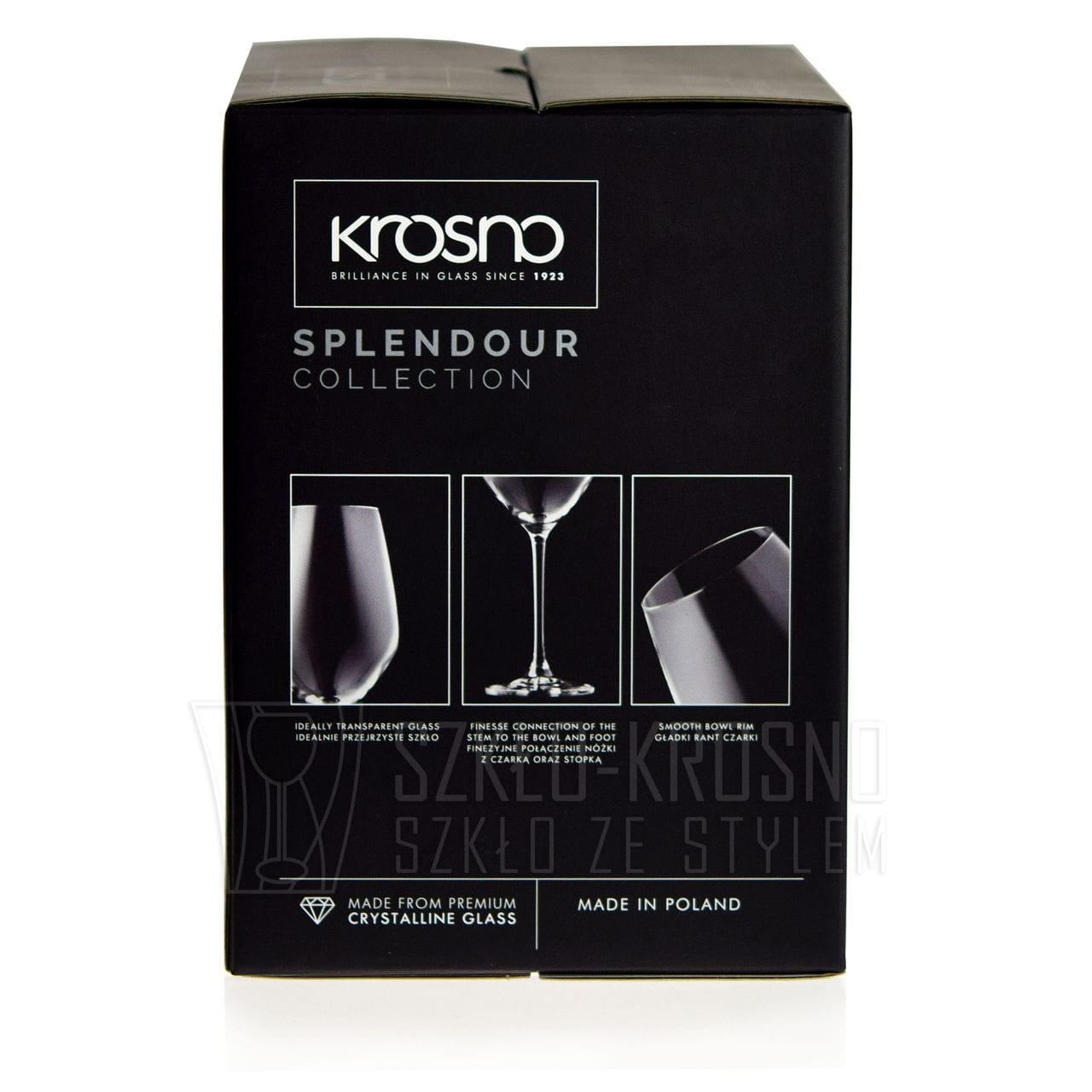 Kieliszki sygnowane są logo producenta w formie naklejki którą w łatwy sposób można usunąć oraz subtelnym grawerem laserowym KROSNO na spodzie wyrobu.