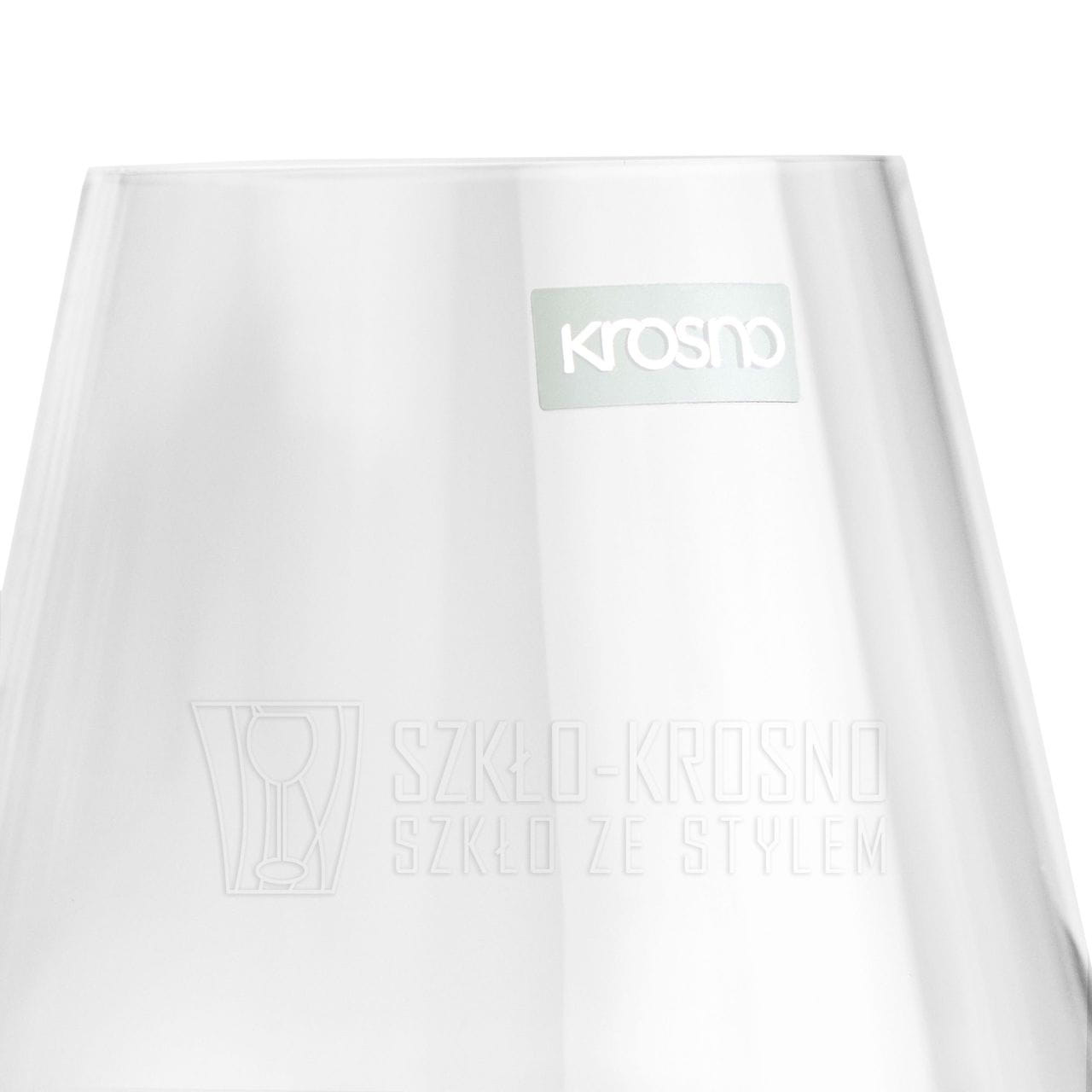Kieliszki sygnowane są logo producenta w formie naklejki którą w łatwy sposób można usunąć oraz subtelnym grawerem laserowym KROSNO na spodzie wyrobu.