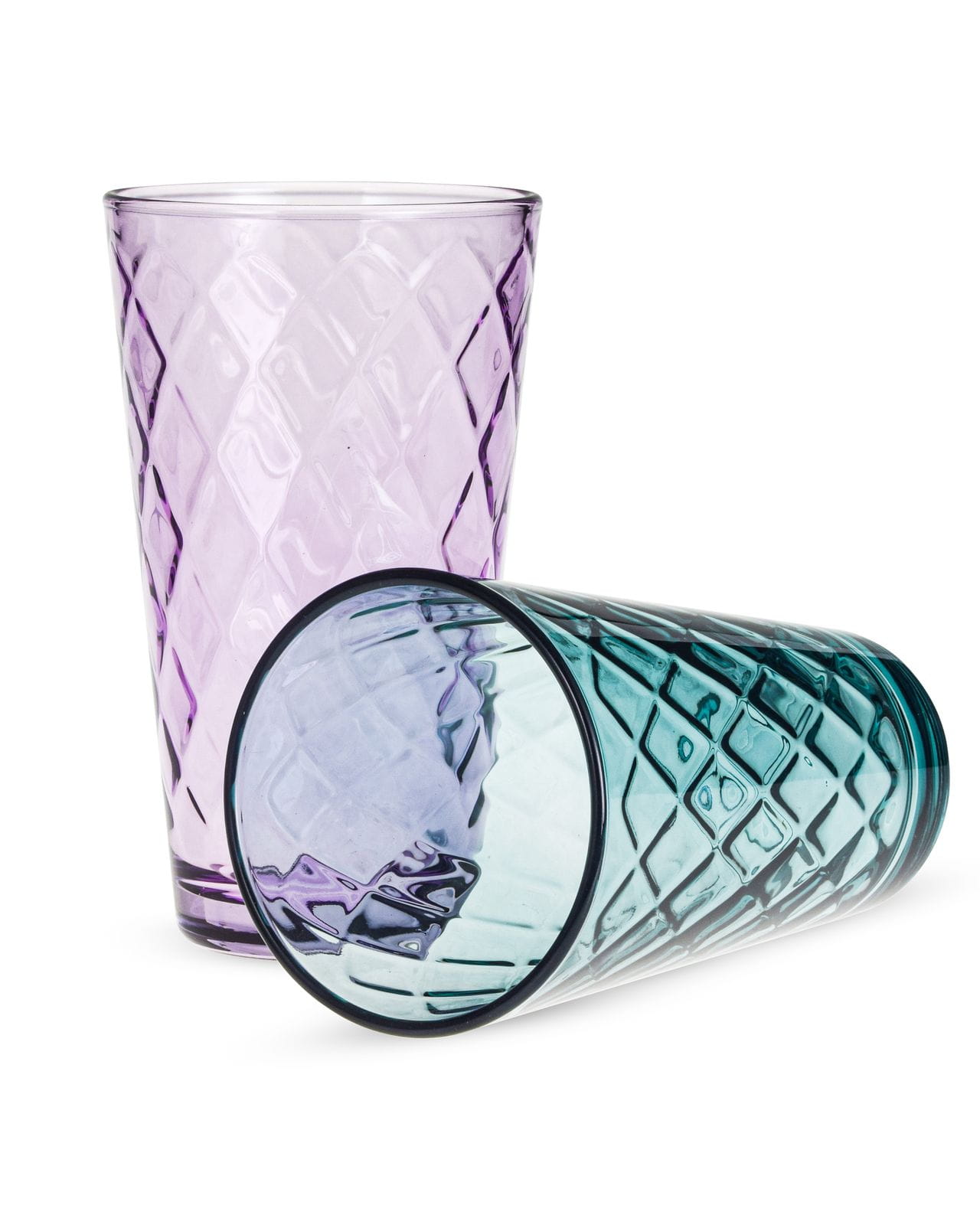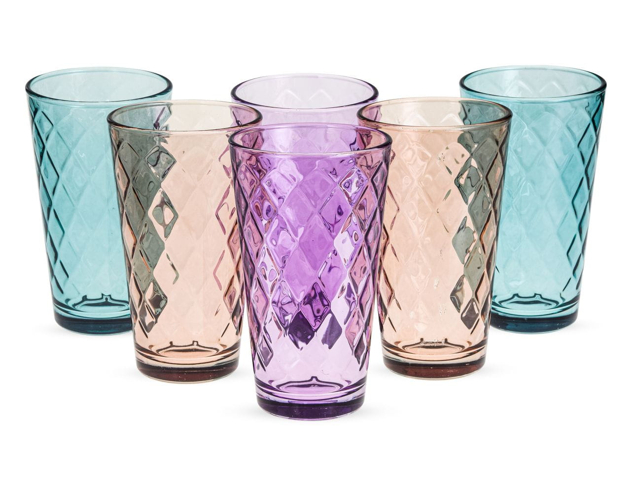 Zestaw zawiera 2 szklanki pomarańczowe, 2 szklanki zielone i 2 szklanki fioletowe.