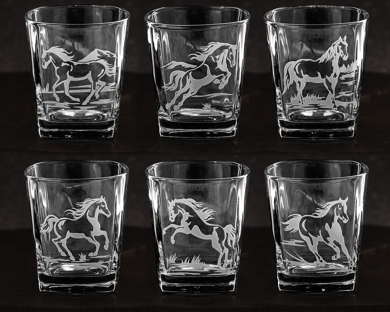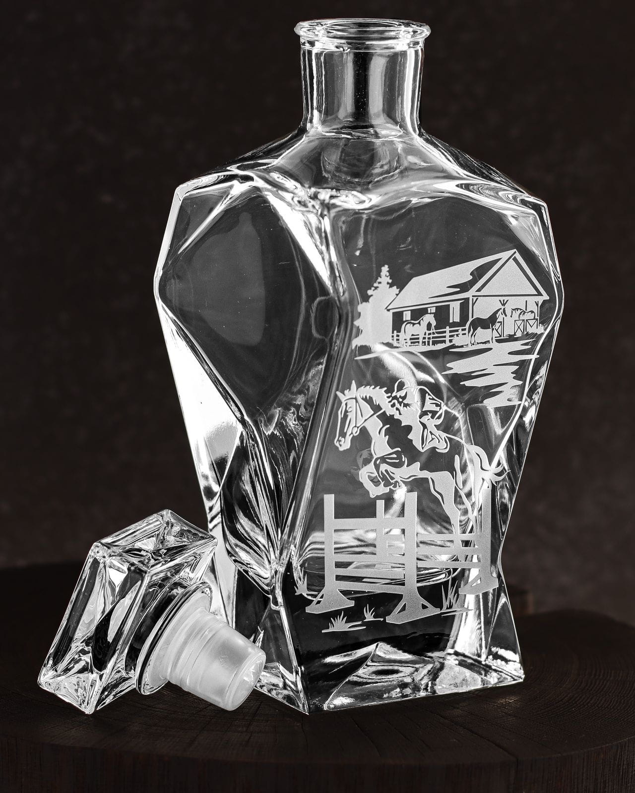 Zestaw do whisky: 6 szklanek 300ml + karafka łamana 750ml grawerowane motywami jeździeckimi