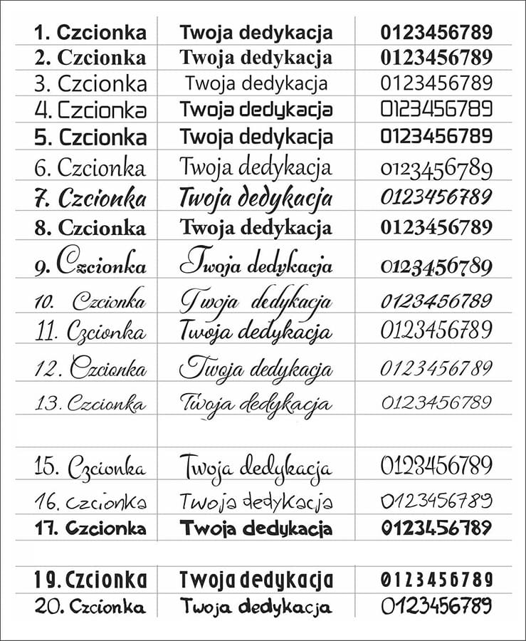 - jeżeli czcionka nie zostanie wskazana przez klienta po zakupie - zostanie dobrana przez grafika w ten sposób aby grawer był możliwie najbardziej czytelny i wyraźny.