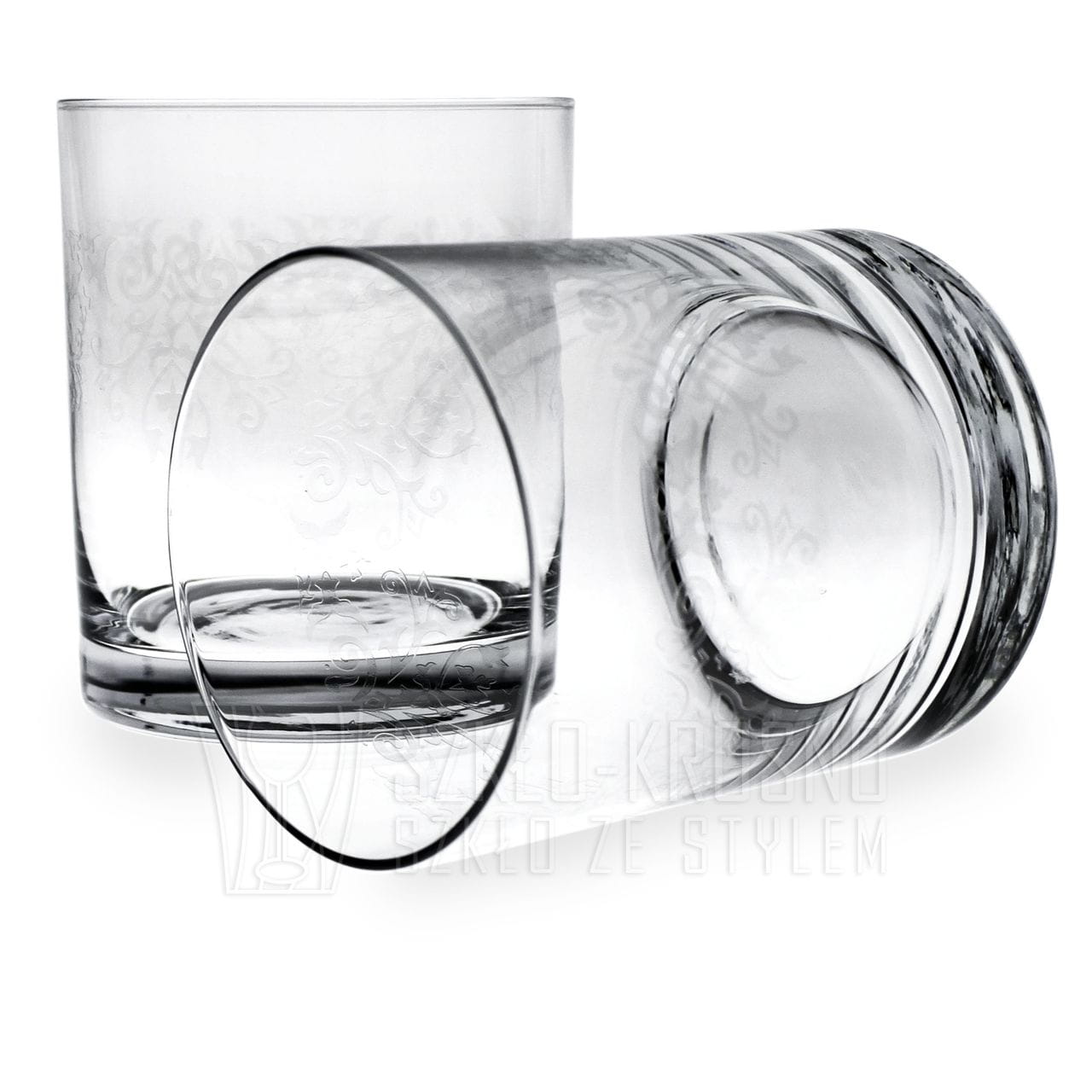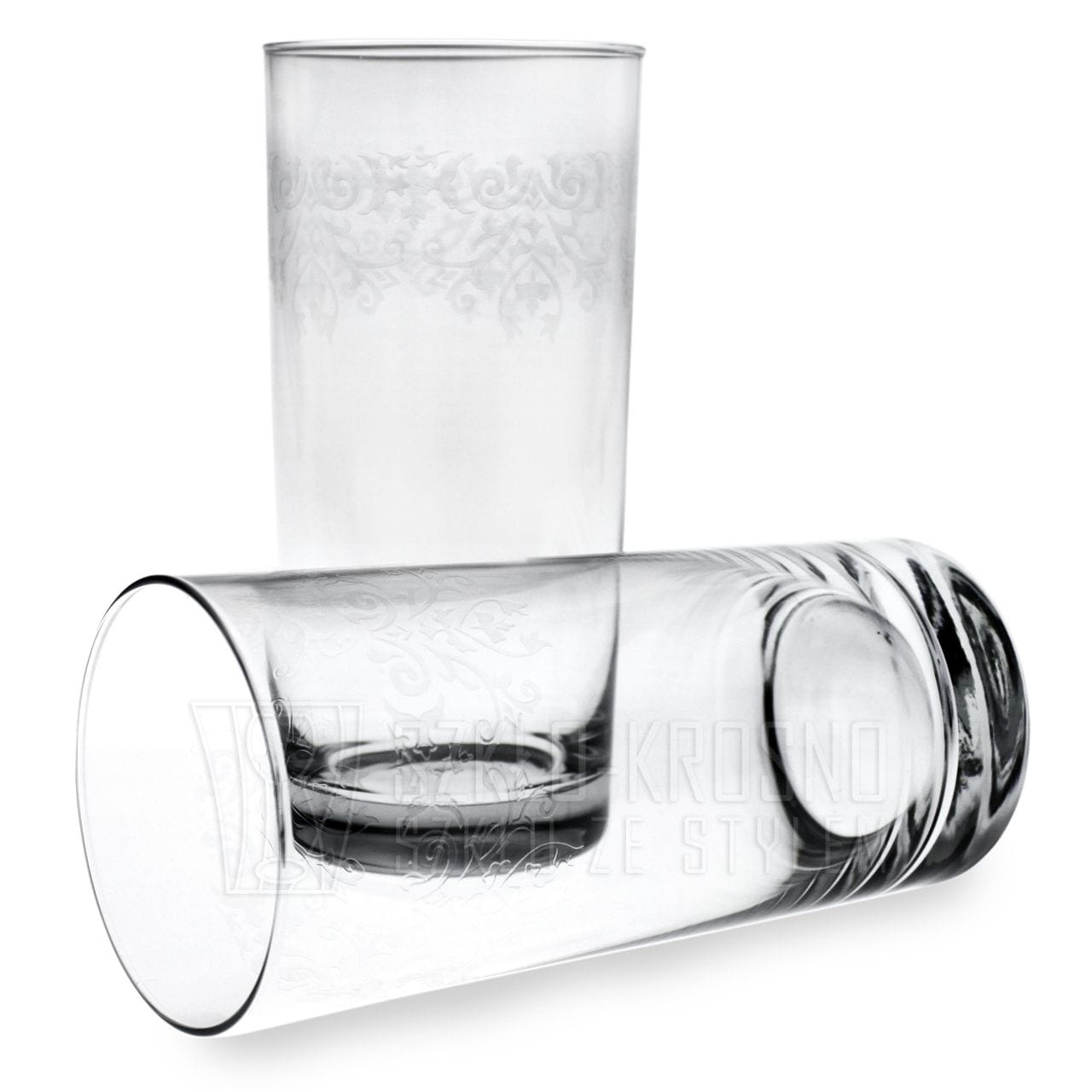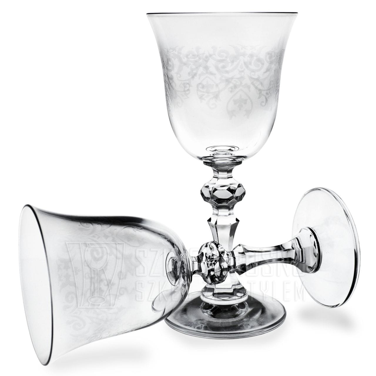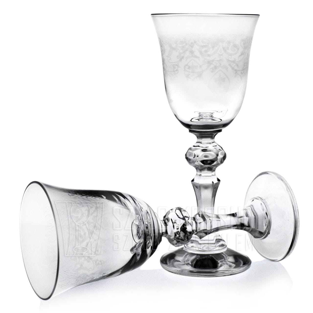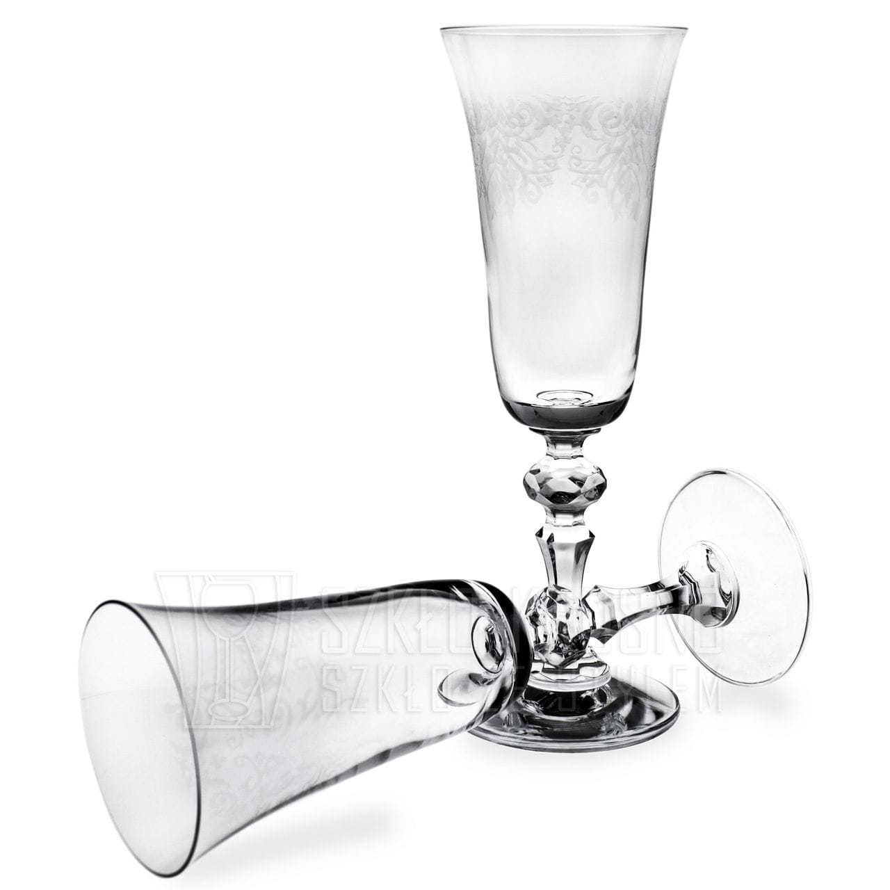 Unikatowy, rozchylany kształt czarki kieliszków, piękne nóżki imitujące kryształ i delikatny bezbarwny ornament na obwodzie.