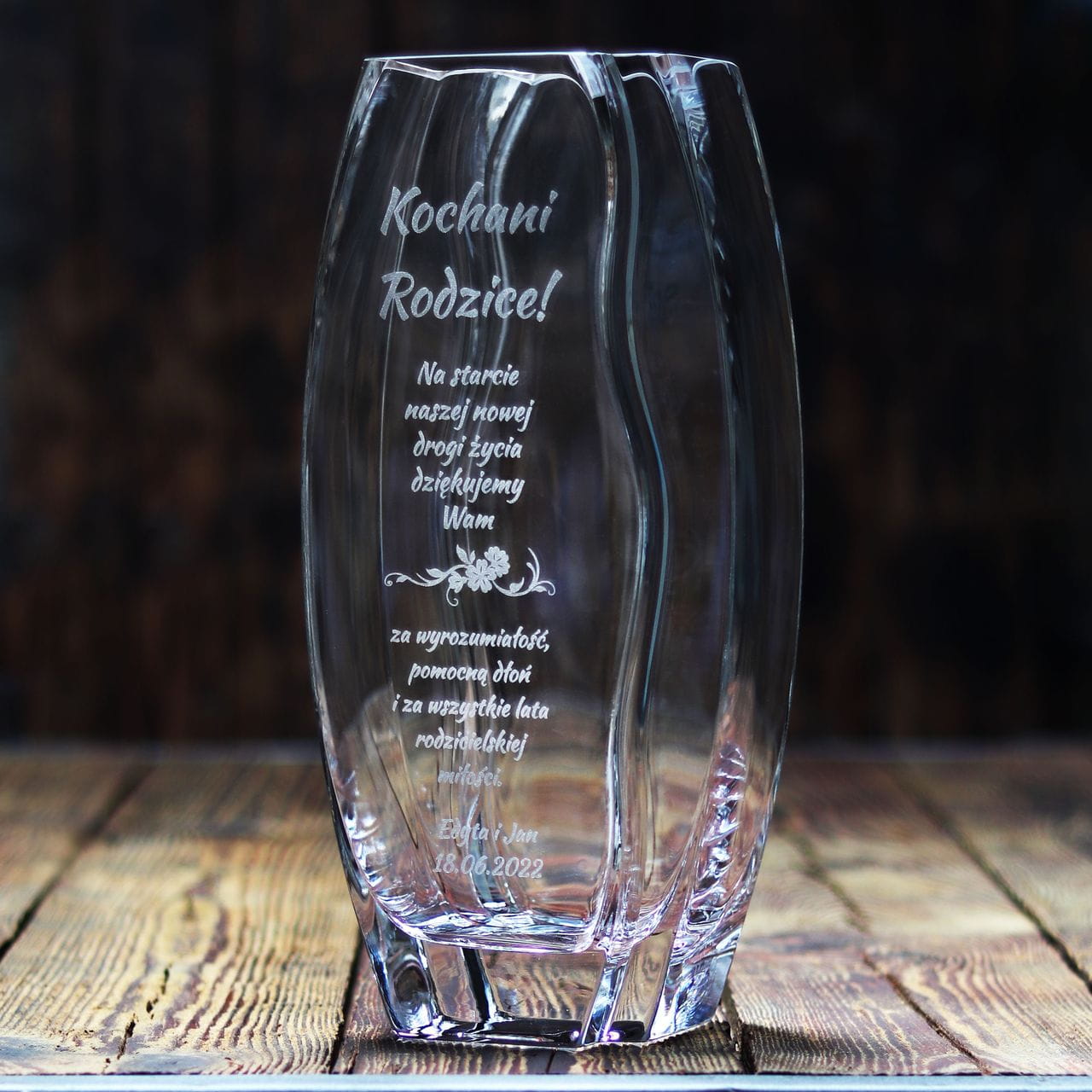 - treść graweru: na górze wazonu: Kasia i Andrzej, 30 lipca 2019, na dole wazonu: życzą Krystyna z Rafałem