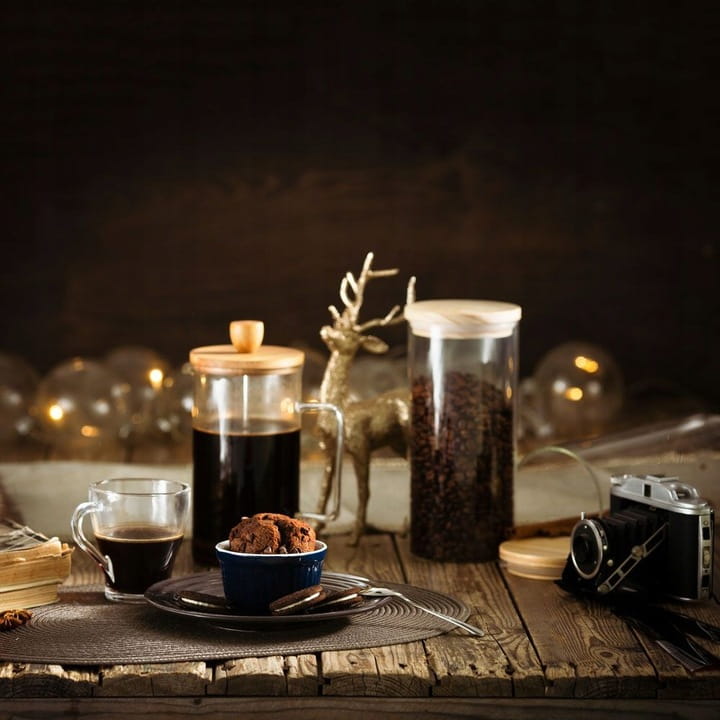 Szklany pojemnik do przechowywania suchej żywności. Wykonany z wysokiej jakości szkła bezołowiowego o wysokiej przezroczystości, dzięki czemu doskonale widać zawartość pojemnika. Drewniana pokrywka z silikonowym uszczelnieniem pozwala utrzymać świeżość przechowywanych produktów. Starannie i elegancko wykonany pojemnik może być także elementem dekoracyjnym. Kolekcja NORDIC to 4 rozmiary pojemników, różniące się jedynie wysokością i pojemnością.