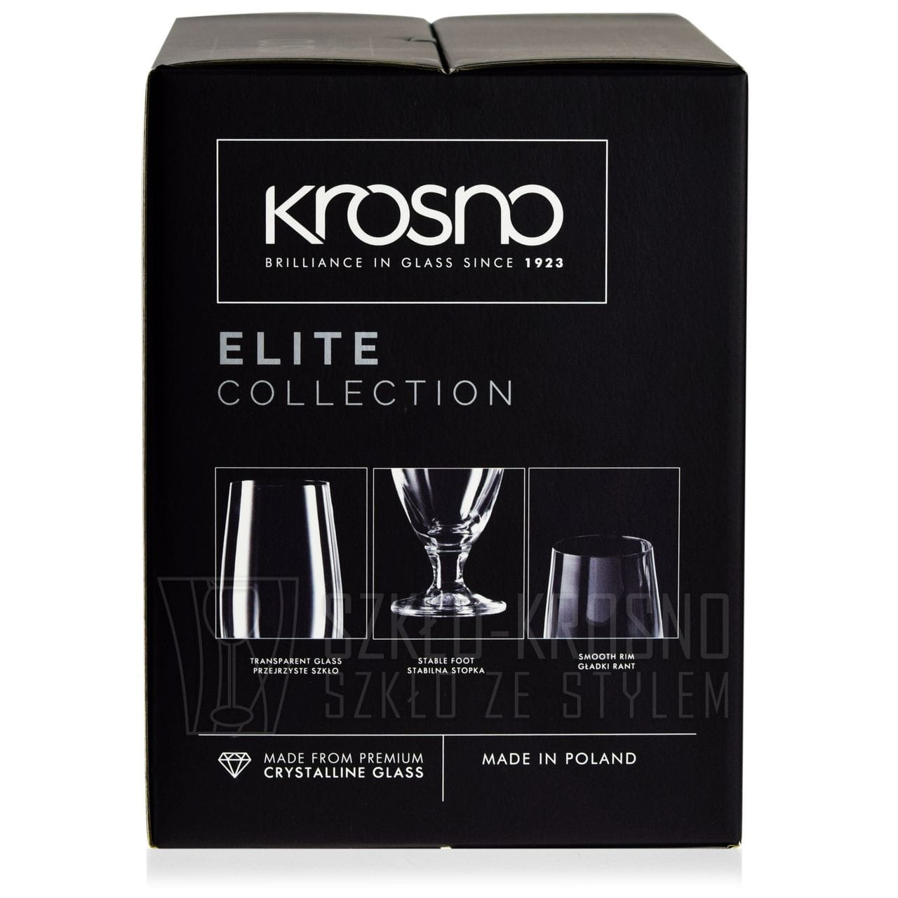 Szklanki sygnowane są logo producenta w formie naklejki którą w łatwy sposób można usunąć oraz subtelnym grawerem laserowym KROSNO na spodzie wyrobu.