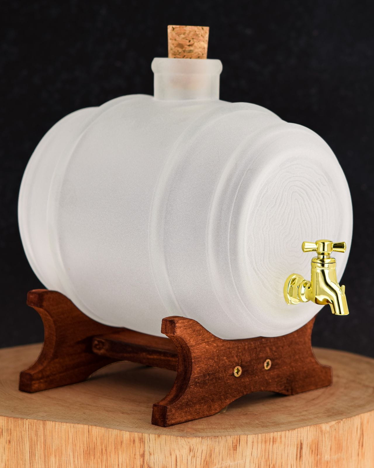 Beczka z przodu i z tyłu zdobiona tłoczonym wzorem plastra pnia drzewa.