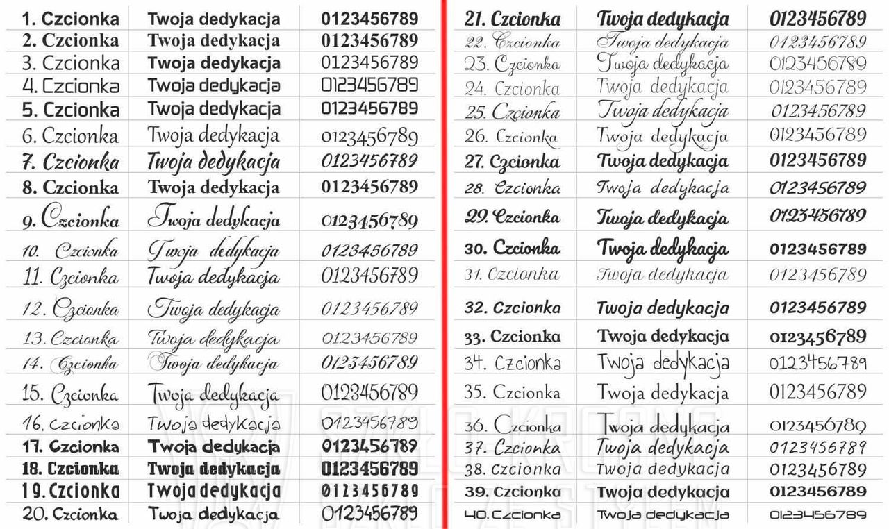 Po zakupie wpisz w "Dodatkowych informacjach" który numer czcionki wybierasz od 1 do 20. UWAGA! Jeżeli czcionka nie zostanie wskazana przez klienta po zakupie - zostanie dobrana tak jak jest to na wybranym wzorze wazonu.