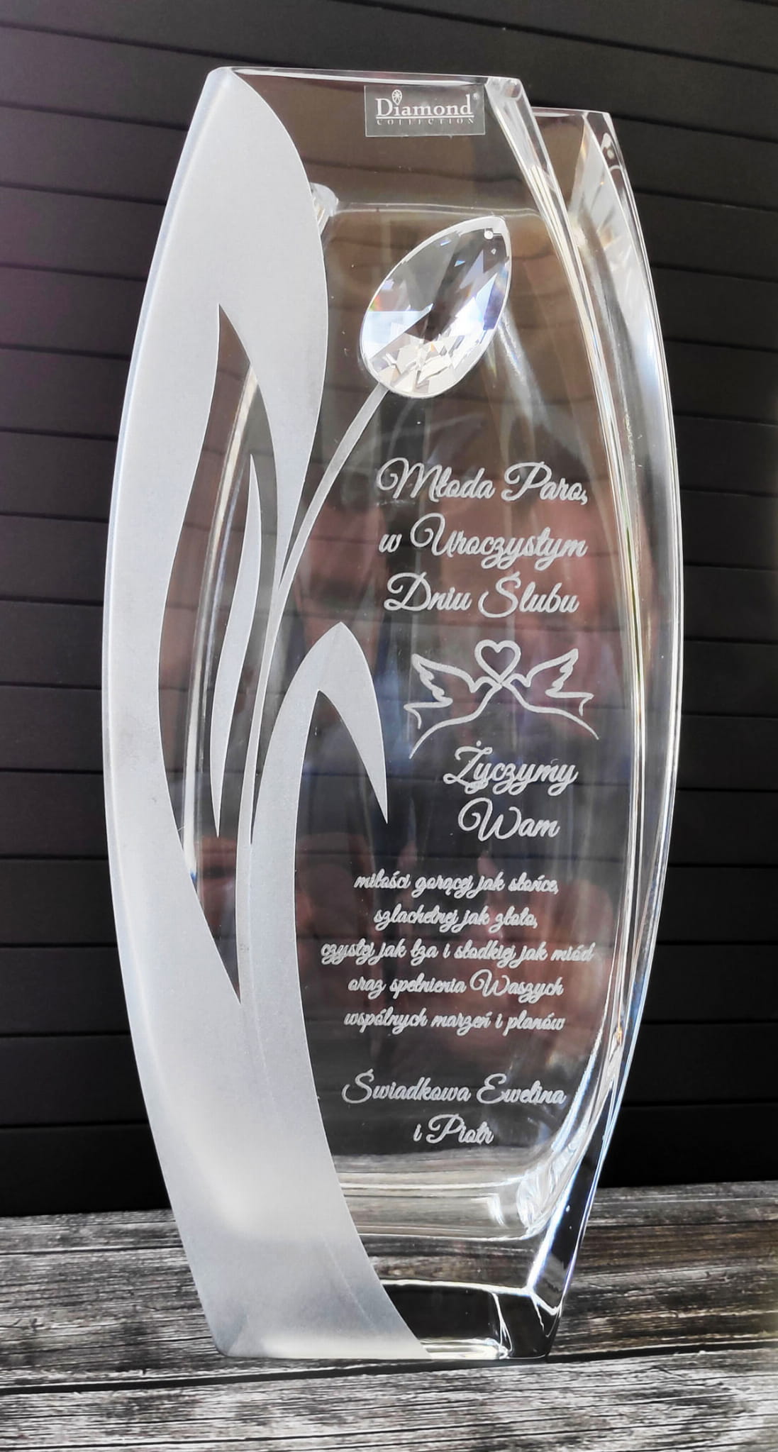 - treść graweru: na górze wazonu: Kasia i Andrzej, 30 lipca 2019, na dole wazonu: życzą Krystyna z Rafałem