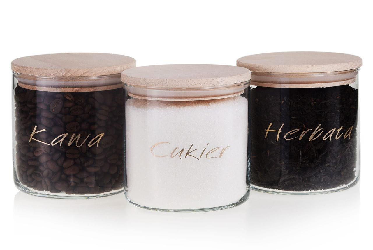 Pojemniki szklane 530ml z drewnianą pokrywką i złotym nadrukiem - KAWA / HERBATA / CUKIER