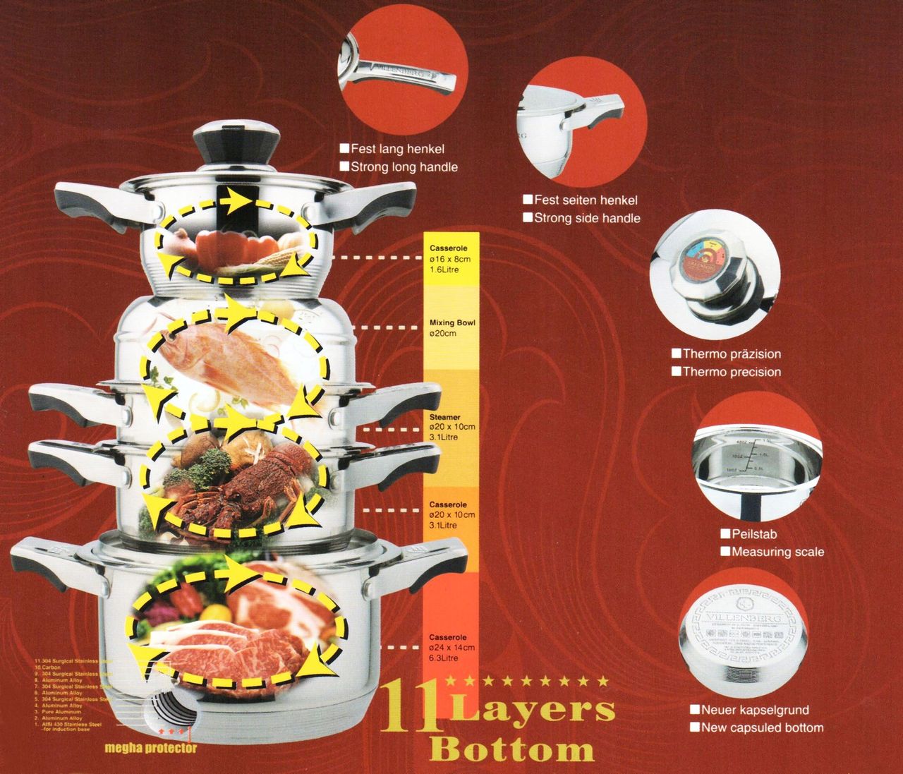 zestaw garnków renomowanej firmy VILLENBERG VB-1717 wykonany z wysokiej jakości stali chirurgicznej 304. Garnki te posiadają 11 warstwowe dno, które świetnie magazynuje i rozprowadza ciepło oraz grube 2mm ścianki boczne. Można bezpiecznie myć je w zmywarce. Pokrywki wyposażone w termometry pozwalające kontrolować temperaturę wewnątrz garnka. Zapewniają pełen komfort użytkowania i najwyższy stopień zadowolenia.